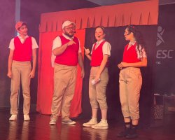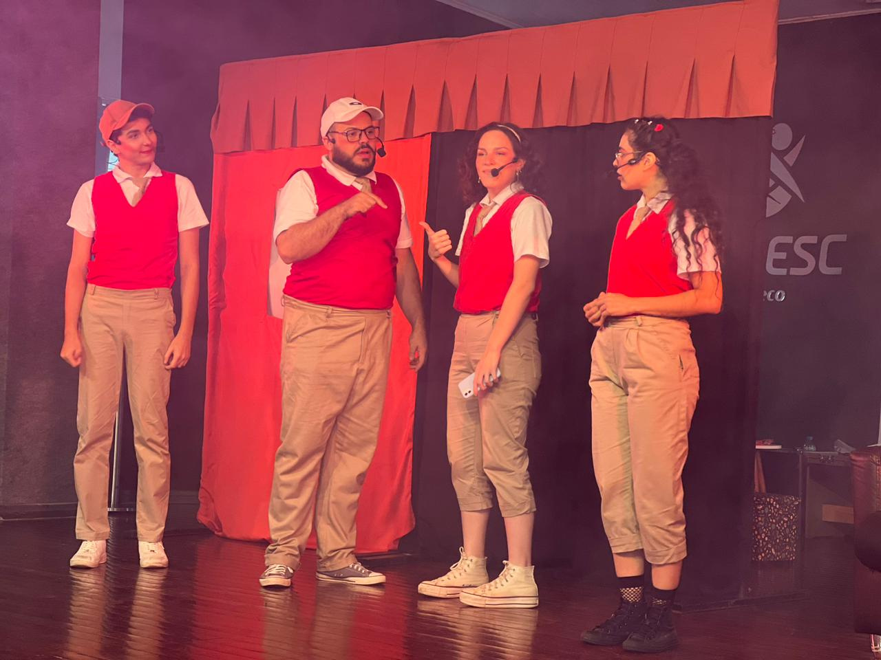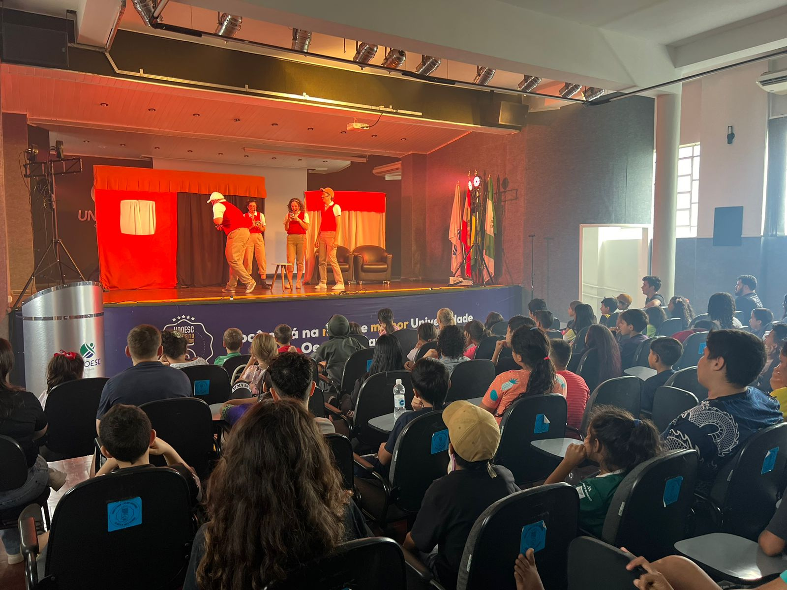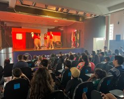 Cerca de 500 crianças e adolescentes usuários dos Centros de Convivência Fortalecimento de Vínculos da Secretaria da Família e Proteção Social (SCFV) participaram nesta segunda-feira (9) da apresentação teatral de abertura do Projeto Desbravadores da arte: o teatro como expressão artística e de conscientização a temas relevantes nos SCFV, no auditório da Universidade do Oeste de Santa Catarina (UNOESC). O teatro foi realizado pela Dusol Produções, do Paraná.