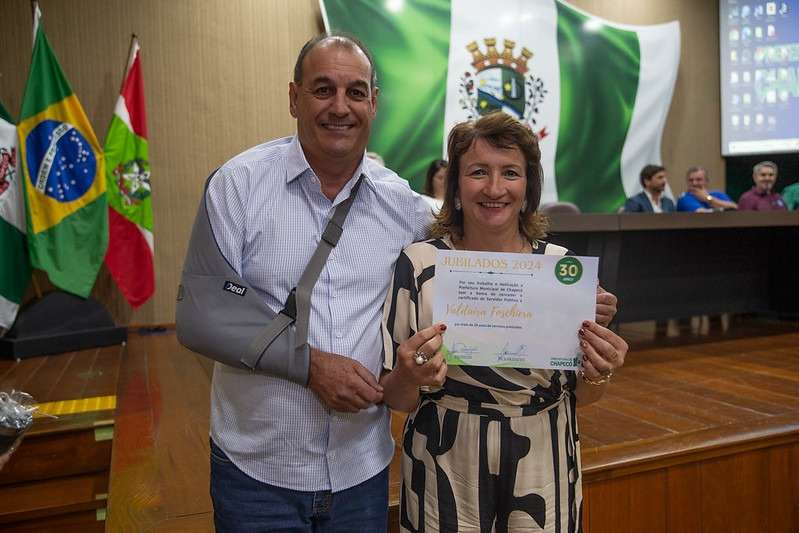 A Prefeitura de Chapecó realizou, na manhã desta terça-feira, o evento dos Jubilados 2024, uma homenagem aos servidores com 30 anos de trabalho na Administração Municipal. Cada um dos 22 homenageados recebeu um certificado e um presente.
