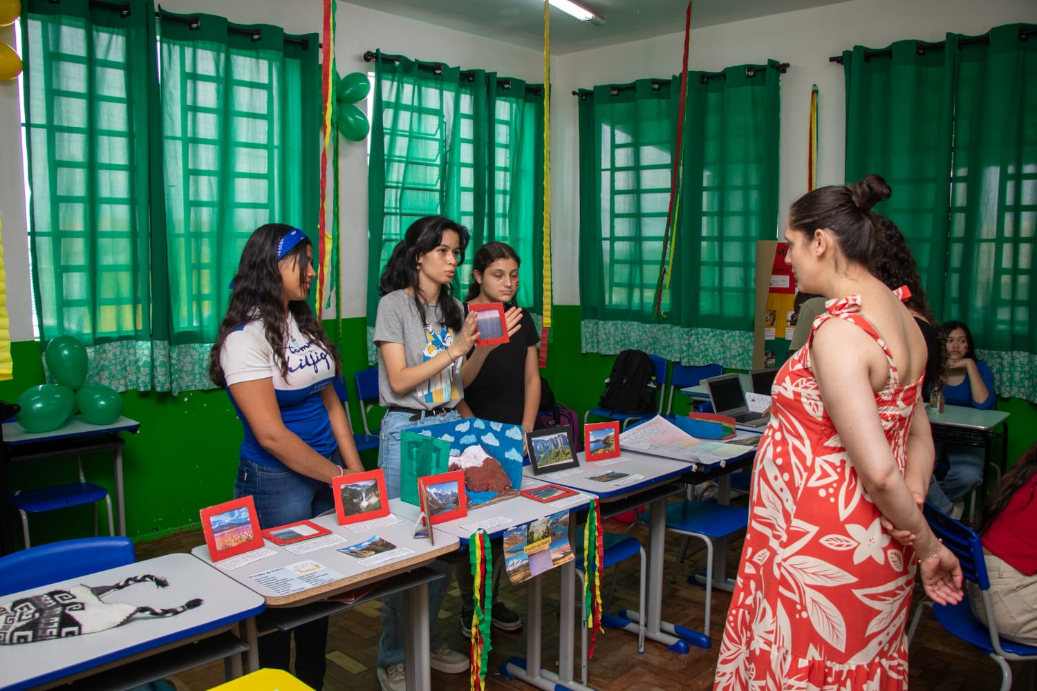 Gabriellys Valentina Rivero, do 8º ano, relatou a experiência de organizar e produzir materiais para a Feira. O país que o nosso grupo pesquisou foi a Bolívia. Começamos primeiro pelas paisagens, então, fizemos uma maquete sobre a Cordilheira dos Andes, que é uma das mais famosas do país. Também estudamos os pontos turísticos naturais, a língua falada e a cultura dos bolivianos. Além de apresentar, visitamos as outras salas para ver as pesquisas dos colegas e eu achei muito bom porque pude conhecer mais sobre outras culturas, disse.