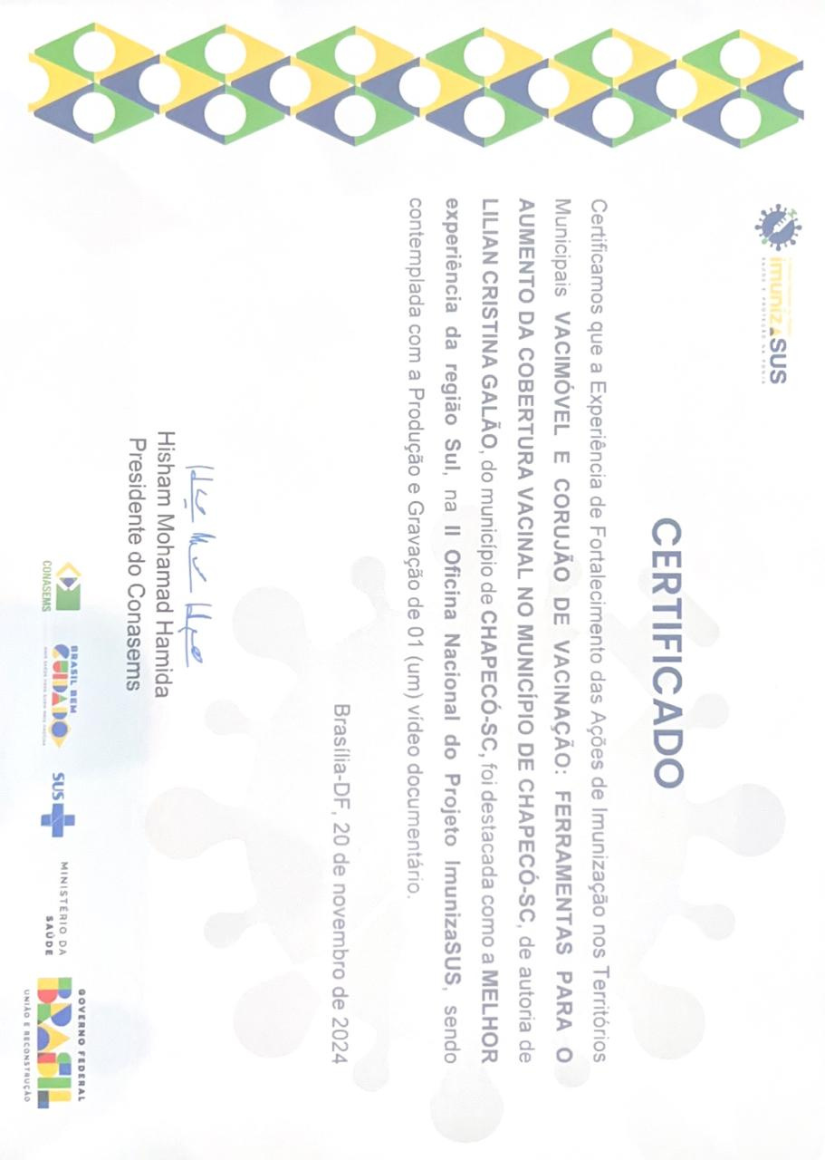 Ter sido um dos ganhadores dessa mostra é um motivo de muito orgulho para nós, chapecoenses, principalmente para quem trabalha nas salas de vacina, nas unidades básicas de saúde, na vigilância epidemiológica, pessoas que trabalham para manter nossos munícipes protegidos. Esse reconhecimento é fruto de um trabalho árduo de todas as equipes, do trabalho árduo de muitas mãos. Esse prêmio não é somente um título para o município de Chapecó, mas representa o fortalecimento do vínculo de nossa comunidade e a valorização do esforço de nossos profissionais, disse Lilian.