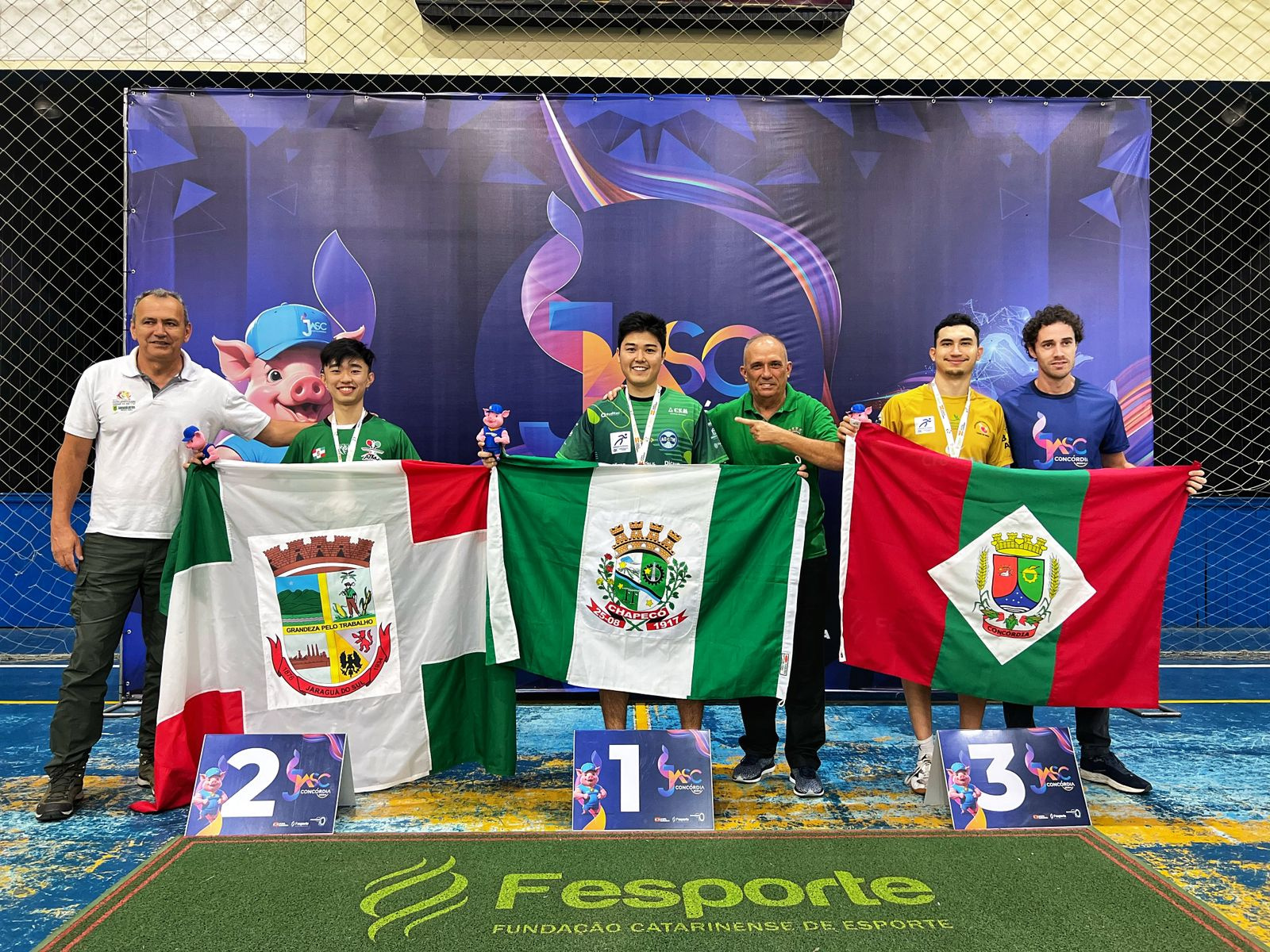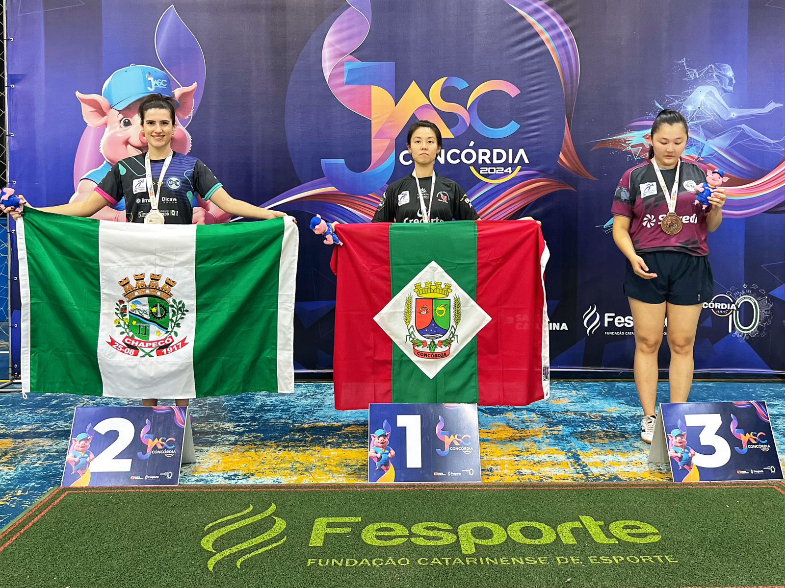 Nesta quinta-feira Chapecó fez bonito também no Tênis de Mesa. No torneio individual, que foi realizado à tarde, Danilo Toma conquistou a medalha de Ouro no masculino. Já Ediane Bresciani ficou com a Prata, no feminino. Pela manhã, aconteceram as disputas por equipes. No masculino Chapecó venceu Florianópolis e garantiu a vaga na final, onde vai enfrentar Jaraguá do Sul. No próximo sábado, já no feminino, derrota por 3x1 para Concórdia. No sábado Chapecó terá a decisão da medalha de Bronze. O Xadrez também venceu suas partidas nesta quinta-feira: no masculino 4x0 sobre Balneário Camboriú e, no feminino, 2,5x1,5 sobre Fraiburgo. Outro destaque do dia foi a Bocha feminino. Na decisão da medalha de Bronze, contra Florianópolis, vitória por 2x0: 12x09 no trio e 12x04 na individual, garantindo a medalha para as Chapecoenses.
