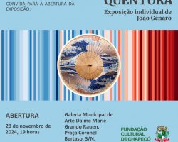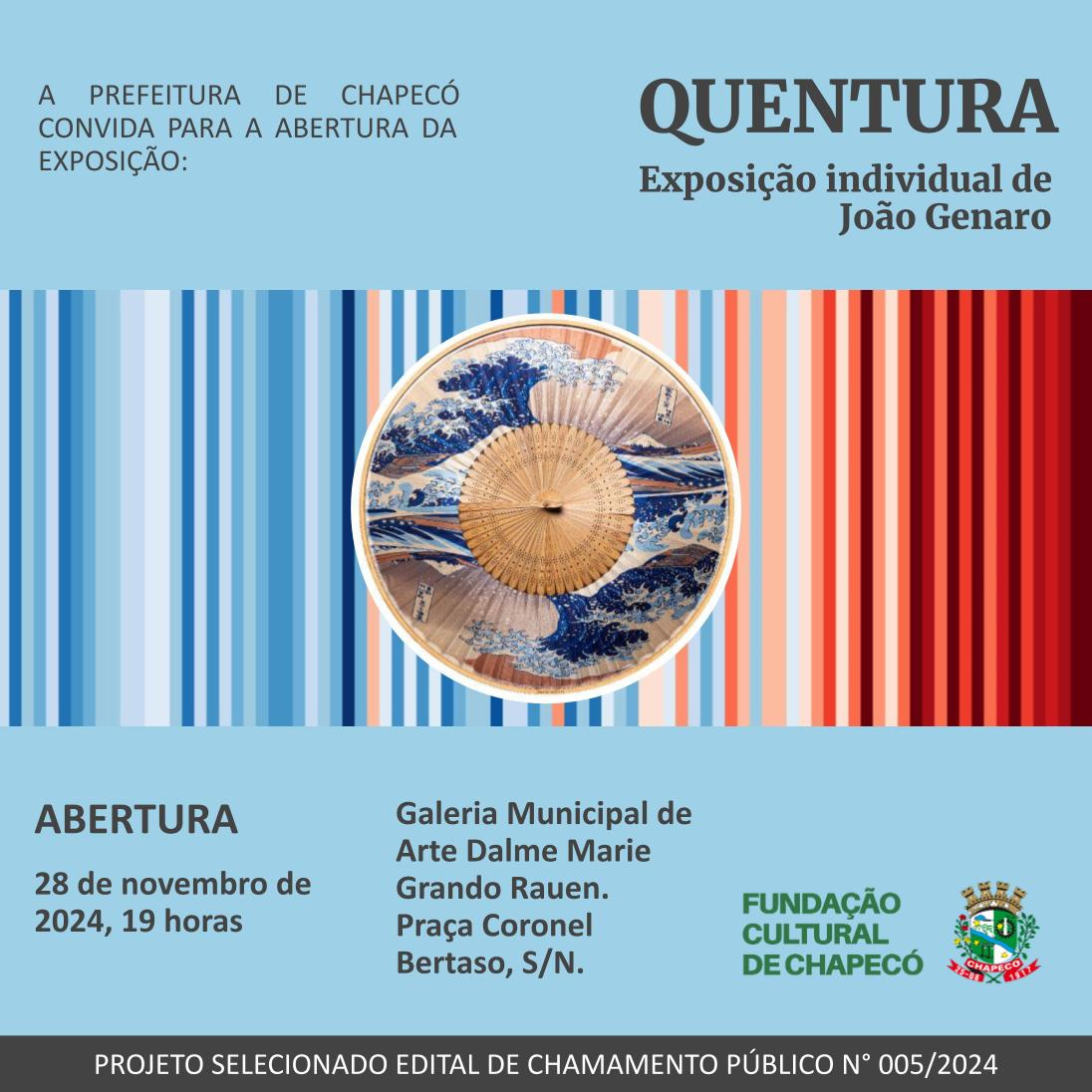 Dia 28 de novembro, quinta-feira, acontece às 19 horas a reinauguração da Galeria Municipal de Arte Dalme Marie Grando Rauen e a abertura da exposição Quentura, selecionada no Edital de chamamento público n° 005/2024 para seleção de exposições de artes visuais na Galeria Municipal de Arte Dalme Marie Grando Rauen, do artista visual João Genaro.