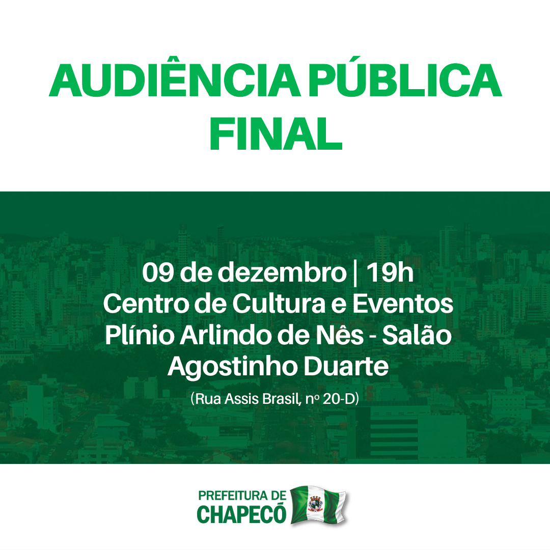 Nesta quarta-feira (4) será realizada a última das 12 audiências públicas regionais de revisão do Plano Diretor de Chapecó, às 19h, na Associação de Moradores do bairro Cristo Rei. E a audiência pública final, que estava prevista para quinta-feira (5), foi transferida para segunda-feira (9), às 19h, no Centro de Cultura e Eventos.