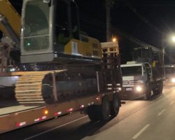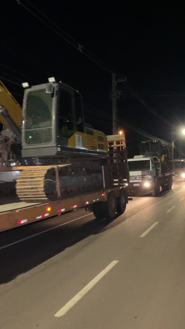 No comboio vão duas PCs e uma retroescavadeira em caminhões prancha, quatro caminhões caçamba, um caminhão-pipa, um veículo da Guarda Municipal, um da Defesa Civil e dois veículos de Apoio.