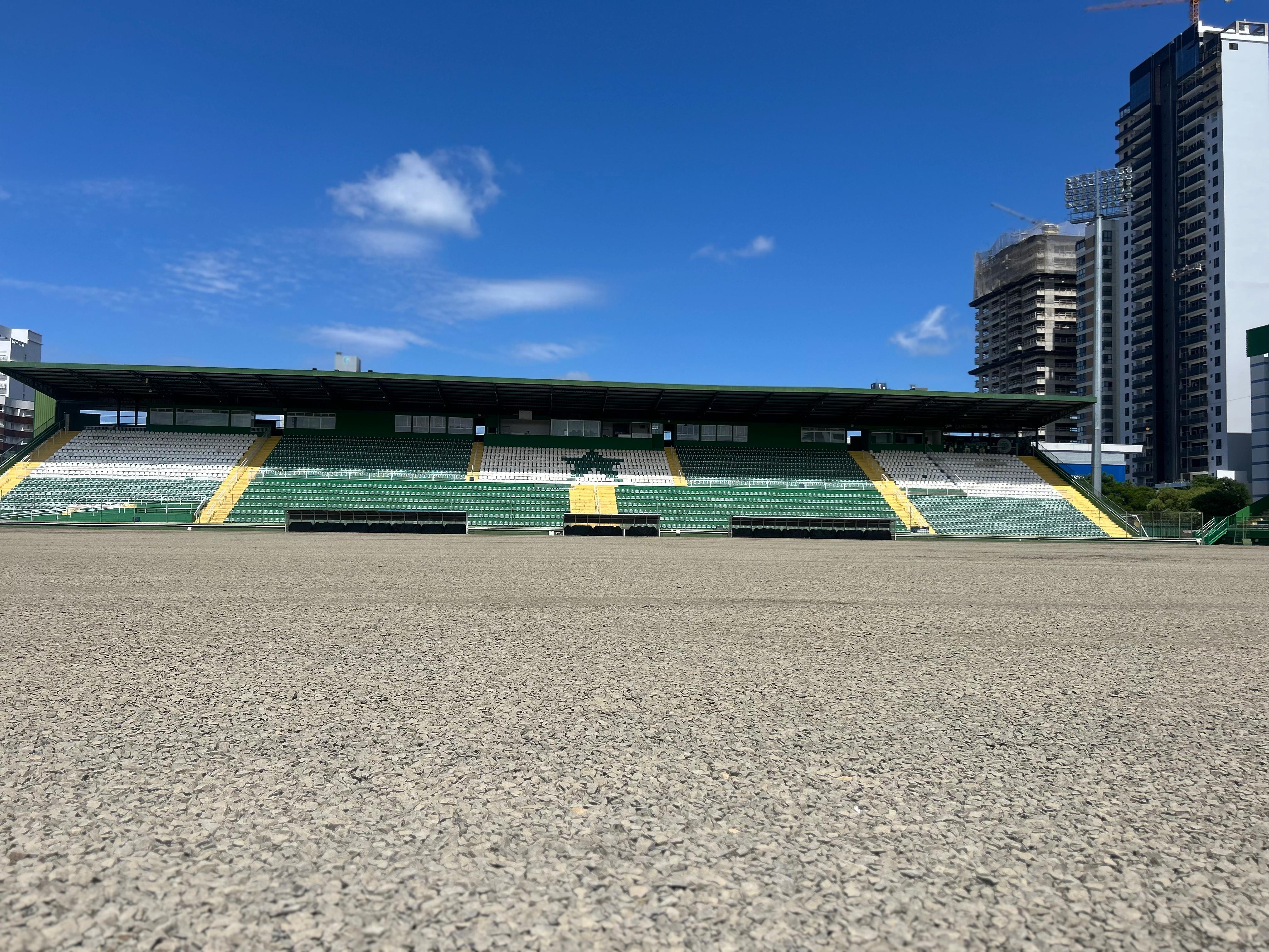 Lembrando que a retirada do gramado antigo e a preparação da base para a colocação do novo gramado estão sendo realizadas pela Chapecoense, que utiliza a estrutura da Arena, que é da Prefeitura.