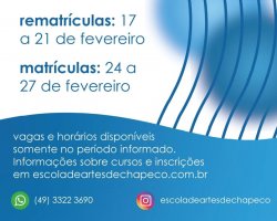 As rematrículas serão entre os dias 17 e 21 de fevereiro. Já as matrículas abrem durante o período de 24 a 27 de fevereiro. Elas são realizadas de forma online pelo site da escola www.escoladeartesdechapeco.com.br. Para se inscrever basta realizar um cadastro com os dados da pessoa interessada e anexar um documento (CPF ou RG).