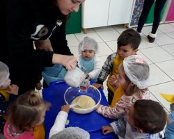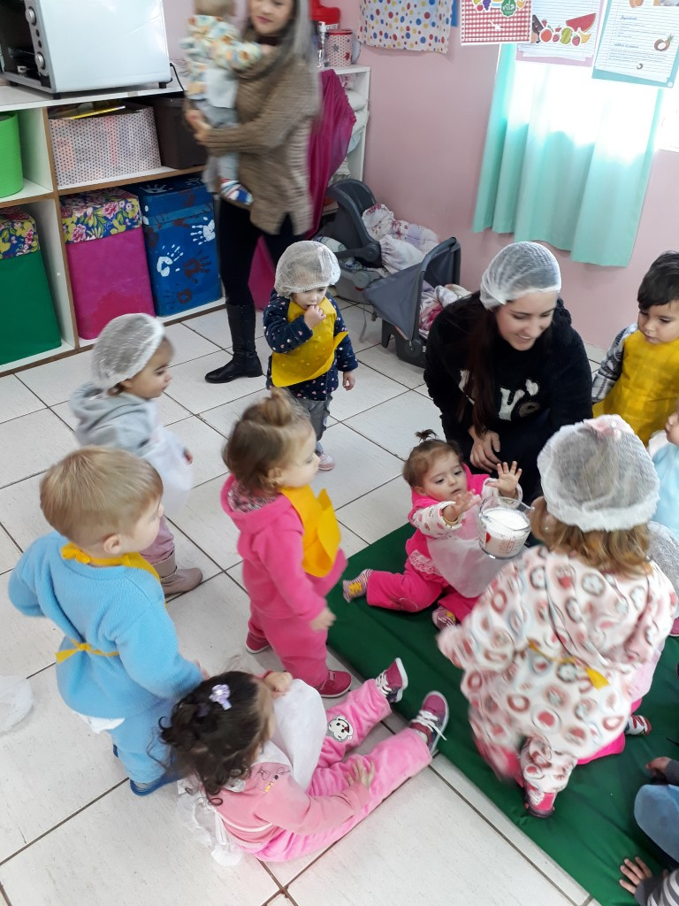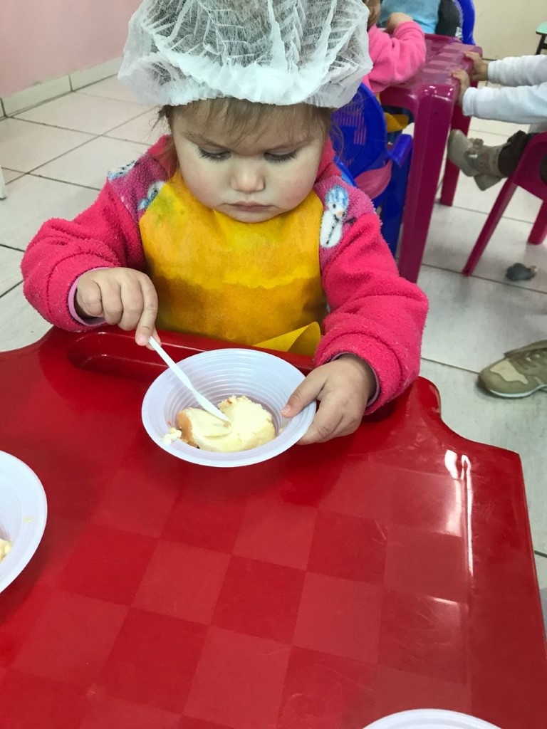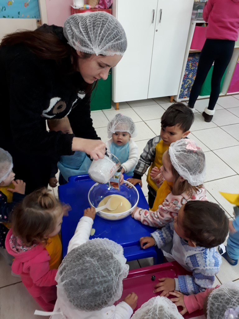 A atividade iniciou com conversas na sala sobre uma alimentação equilibrada e diversificada. A partir dessa conversa, a professora mostrou um livro de receitas, sempre conversando e interagindo com as crianças na sala. Também disponibilizou para as famílias uma muda de Kefir (bichinho que faz o iogurte natural) com informações sobre suas propriedades nutritivas, e solicitou que junto com a criança, preparassem o iogurte. Junto com as famílias a criança foi observando o processo e pedindo para os pais anotarem, além de fotografar todo o processo, contando como foi a experiência. Na escola, a professora também organizou um lanche a base do Kefir. Foi um pudim de kefir, que as crianças ajudaram a fazer e depois degustaram.