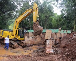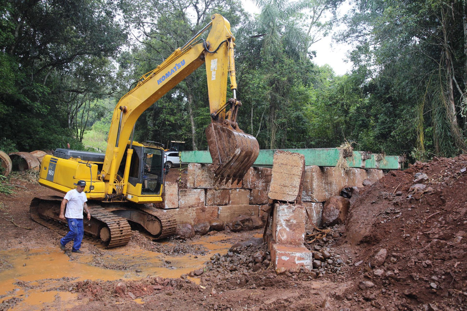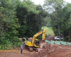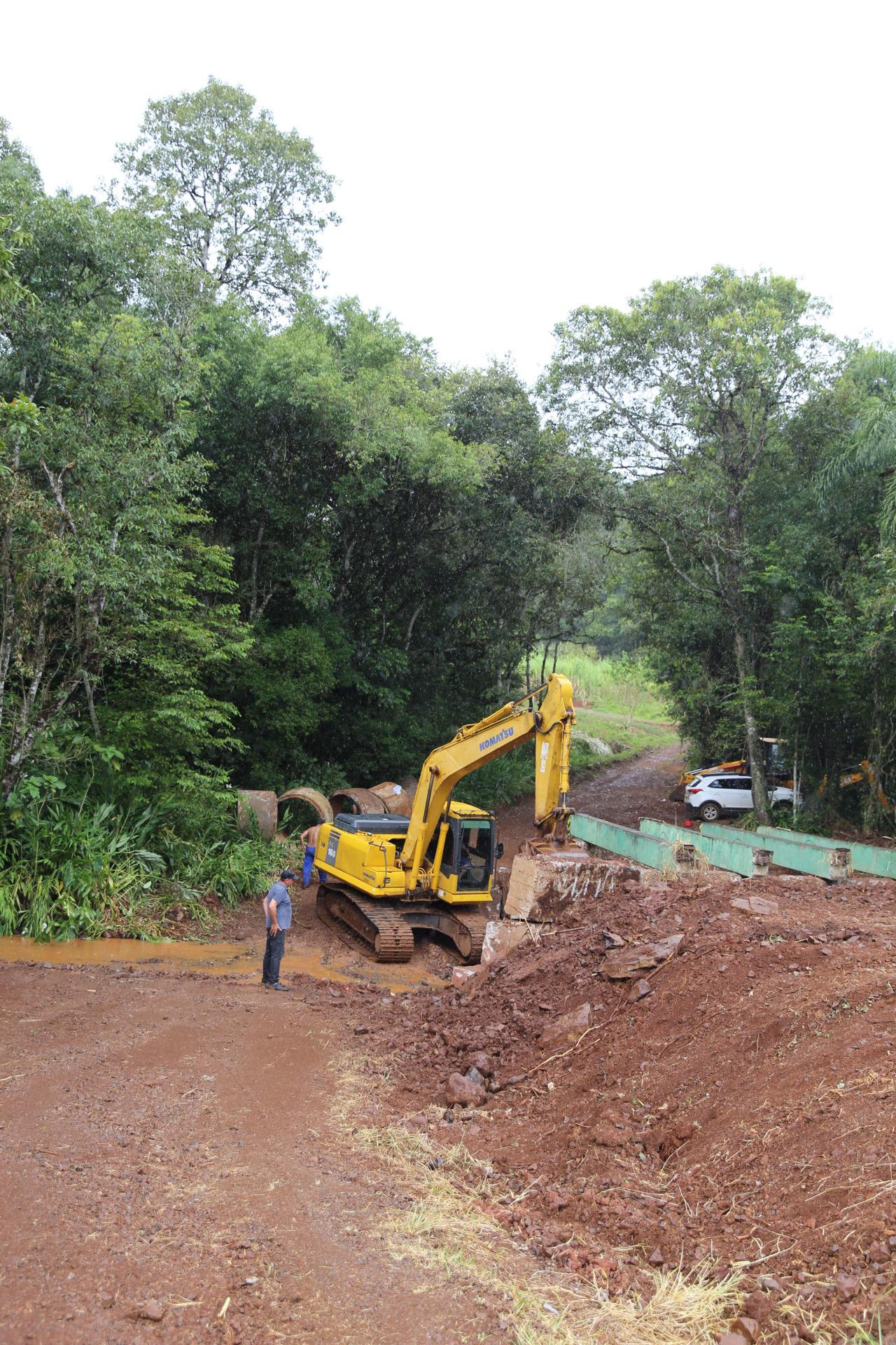 As equipes da Prefeitura de Chapecó estão construindo uma ponte que está localizada na Linha Sede Trentin. Ela vai ligar a comunidade de Linha Marcon com a Aldeia Toldo Chimbangue e a Comunidade Guarani.