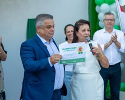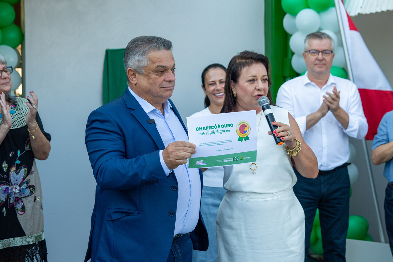 A Prefeitura de Chapecó é Ouro na Alfabetização. Durante a solenidade de inauguração da Escola Básica Municipal Cívica de Inovação e Tecnologia Eli Maria Bellani, realizada na terça-feira (11), na Unochapecó, a secretária de Educação, Astrit Tozzo, entregou o certificado recebido do Ministério da Educação, para o prefeito João Rodrigues.