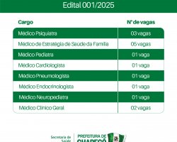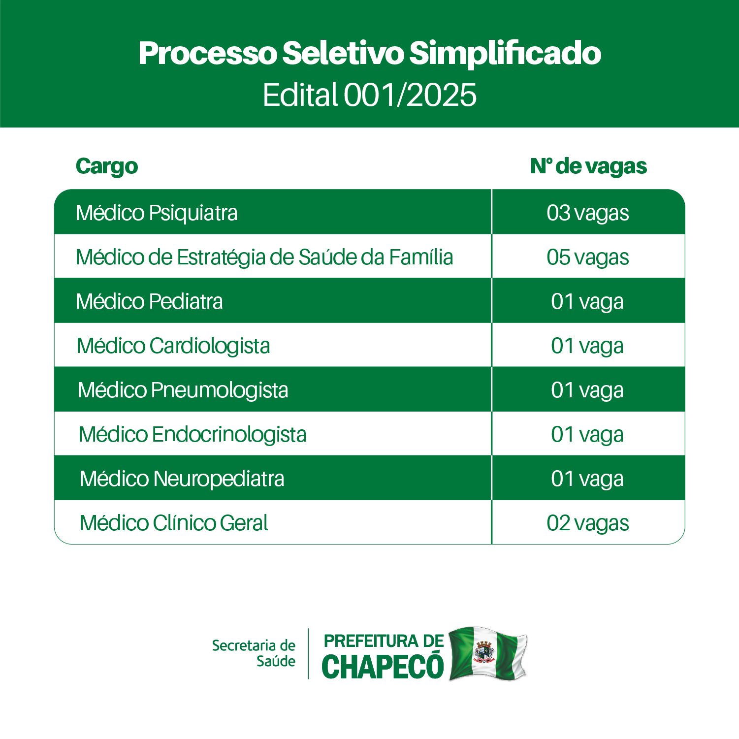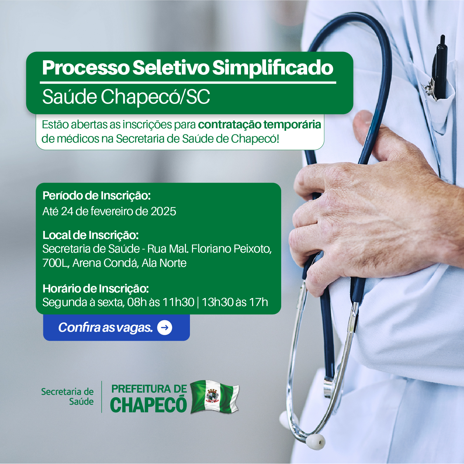 A Prefeitura de Chapecó está com processo seletivo para área de saúde. As inscrições seguem até segunda-feira (24) e as vagas disponíveis são para Médico Psiquiatra, Médico de Estratégia de Saúde da Família, Médico Pediatra, Médico Cardiologista, Médico Pneumologista, Médico Endocrinologista, Médico Neuropediatra e Médico Clínico Geral. O edital completo está publicado no site da prefeitura.