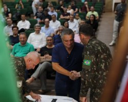 O prefeito de Chapecó, João Rodrigues, participou da solenidade de posse, nesta quarta-feira (26), no auditório da Prefeitura de Chapecó, de evento promovido pelo 14º Regimento de Cavalaria Mecanizado de São Miguel do Oeste. Tomaram posse prefeitos de 31 municípios que assumiram a função de presidentes das Juntas Militares. As posses dos prefeitos acontecem a cada troca de mandato eleitoral.