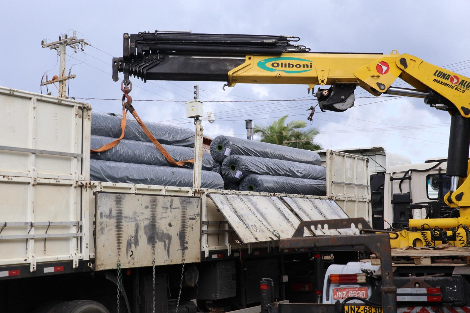 A grama sintética é embalada em 51 rolos transportados em duas carretas. São materiais extremamente pesados e que necessitam de grande cuidado ao serem descarregados, lembra o secretário de Desenvolvimento Sustentável e Obras Estruturantes, Maurício Lise da Rocha. Os trabalhos devem ser concluídos no mês de abril.