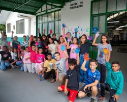 A gente fez uma árvore de mãos com várias cores para representar as diferentes religiões ao longo tempo e também as diferenças entre nós. Aprendemos que devemos respeitar as pessoas e suas crenças, disse Agatha Valentina Cândido Panasiuk, do 5º ano.