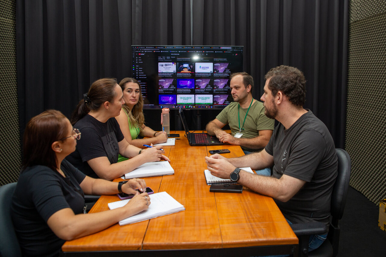 A equipe de articuladores da Secretaria de Educação realizou uma reunião, no estúdio de produções midiáticas da própria secretaria, para debater sobre a retomada do Clube de Astronomia Desbravadores do Universo.