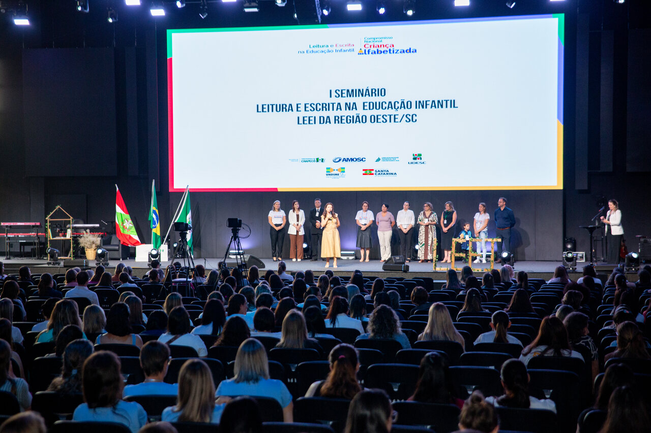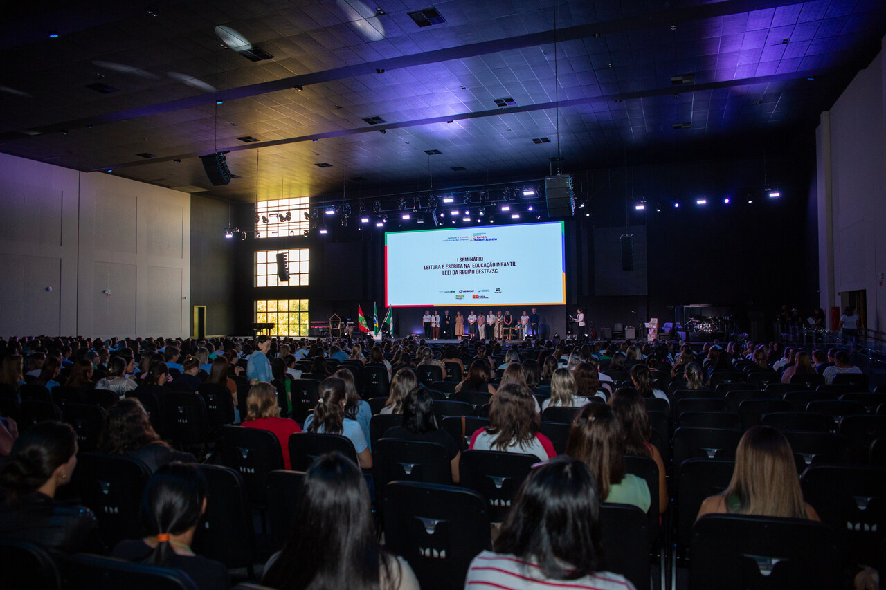 Aconteceu, nesta terça-feira (18), no auditório da GET Church, o Seminário Leitura e Escrita na Educação Infantil - LEEI. Participaram do momento professores da pré-escola e demais cursistas das regiões da Associação dos Municípios do Oeste de Santa Catarina - AMOSC, Associação dos Municípios do Entre Rios - AMERIOS e Associação dos Municípios do Extremo Oeste de Santa Catarina - AMEOSC.
